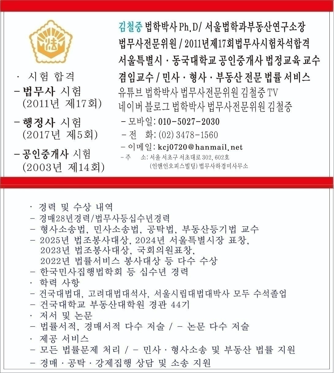 사회가 빠르게 변하고 의견이 분분한 시대일수록, 법조인은 감정이 아닌 원칙으로 중심을 잡아야 한다고 믿습니다. 조용히 기록을 읽고, 사실을 확인하며, 의뢰인의 삶에 실질적인 도움이 되는 방향을 찾는 것, 그것이 제가 선택한 직업의 본질이라고 생각합니다. 필요하신 분들께는 언제든지 현실적인 상담과 검토를 통해 도움을 드리고자 하며, 상담이 필요하신 경우 010-5027-2030으로 연락 주셔도 괜찮습니다. 유튜브와 네이버블로그, 티스토리에서도 구독과 좋아요로 함께해 주신다면 연구와 실무를 이어가는 데 큰 힘이 됩니다.